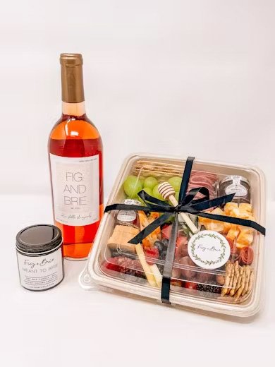 One fig + brie signature picnic box, one 750 ml fig + brie rosé, and one meant to brie candle