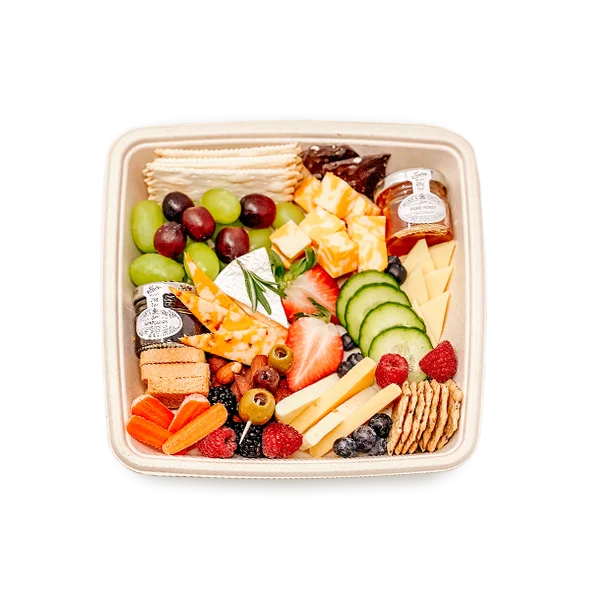Seasonal fruit and veggies accompanied by brie, havarti, gouda, spicy jack, smoked gouda, colby jack, almonds, olives, dark chocolate with almonds, jam, and honey